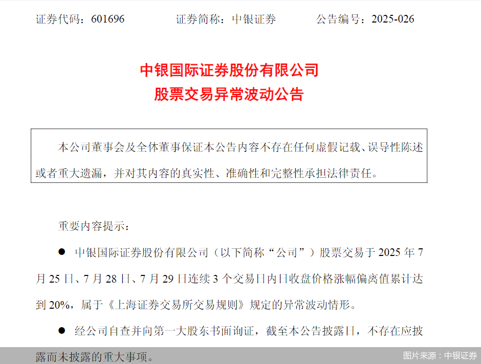 中银证券回应股价异常波动:不存在应披露而未披露的重大事项