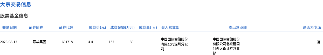 交易概况 - 际华集团于2025年8月12日发生大宗交易 成交量为30万股 成交金额为132万元 占当日总成交额的0.03% [1] - 大宗交易成交价格为4.4元 与市场收盘价4.4元完全持平 未出现折价或溢价情况 [1] 交易细节 - 该笔交易证券代码为601718 由同一券商不同营业部之间完成 买入方为中国国际金融股份有限公司深圳分公司 卖出方为中国国际金融股份有限公司北京建国门外大街证券营业部 [2] - 交易记录显示买卖双方均属中国国际金融股份体系 表明可能为内部仓位调整或机构内部资金调配 [2]