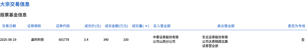 晶科科技今日大宗交易折价成交100万股,成交额340万元