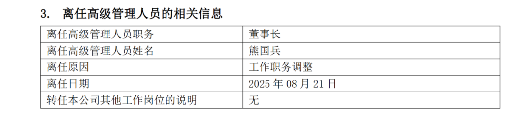 核心人事变动 - 公司董事长熊国兵因工作职务调整于2025年8月21日离任 [1][3] - 在新任董事长履职前由总经理乔震代为履行董事长职务 [1] - 变更事项已经公司股东审议通过并将按法律法规履行备案程序 [3] 新任高管背景 - 代任董事长乔震拥有硕士学历及证券公司高级管理人员资格和基金从业资格 [2] - 乔震自2012年8月加入公司历任产品与机构业务部总经理、总经理助理、副总经理等职务 [2] - 现任公司董事、总经理具备丰富的内部履历和专业资格 [2] 离任高管情况 - 原董事长熊国兵离任后不会转任公司其他工作岗位 [3] - 公司在职期间为推动业务发展做出重要贡献获得高度评价 [3] - 市场关注高层变动可能对公司业务发展和战略布局产生影响 [3]