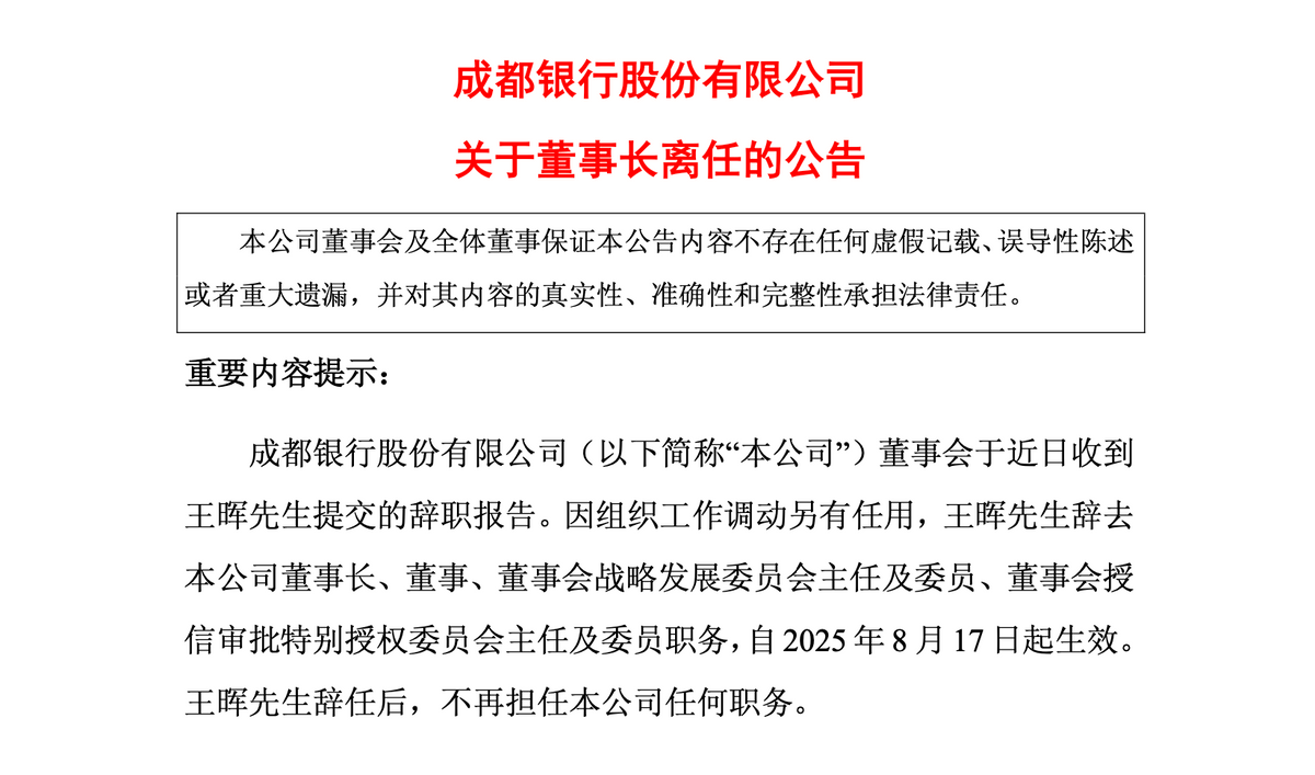 人事变动 - 成都银行董事长王晖因组织工作调动辞职 自2025年8月17日起生效 不再担任任何职务 [1] - 黄建军接任成都银行党委书记 并被提名为董事长 原任成都农商行董事长 [1] - 王晖调任成都农商行党委书记 并被提名为董事长 形成两家银行董事长对调安排 [1][2] 高管背景 - 黄建军2020年6月加入成都农商行 历任党委副书记、行长 2022年5月起任党委书记 8月任董事长 [2] - 王晖在成都银行任职20年 2005年任党委委员、行长 2018年起担任党委书记、董事长 [2] 成都银行业绩表现 - 2024年末总资产1.25万亿元 存款8800亿元 贷款7400亿元 均为上市前2.8-5倍 连续四年千亿级增长 [2] - 2024年营业收入229.82亿元 同比增长5.9% 净利润128.58亿元 同比增长10.17% 连续七年业绩增长 [2] - 2024年末不良贷款率0.66% [4] 成都农商行业绩表现 - 2024年末总资产9142.63亿元 贷款4875.69亿元 存款6727.24亿元 [3] - 2024年营业收入183.5亿元 同比增长5.86% 净利润64.71亿元 同比增长11.46% [3] - 2024年末不良贷款率1.02% [4] 国资增持计划 - 成都国资委实控企业原计划以不超过17.59元/股增持成都银行0.939%至1.878%股份 [4] - 因股价持续超过增持价格上限 调整为增持金额7亿元至14亿元 实施期限延长至12个月 [4]