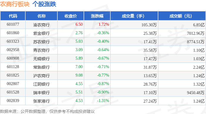 证券之星消息,1月7日农商行板块较上一交易日下跌0.57%,瑞丰银行领跌。当日上证指数报收于 4085.77,上涨0.05%。深证成指报收于14030.56,上涨0.06%。农商行板块个股涨跌见下表: | 代码 | 名称 | 收盘价 | 涨跌幅 | 成交量(手) | 成交额(元) | | --- | --- | --- | --- | --- | --- | | 601077 | 渝农商行 | 6.39 | 0.16% | 58.48万 | 3.74亿 | | 002807 | 江阴银行 | 4.59 | 0.00% | 36.54万 | 1.68亿 | | 002839 | 张家港行 | 4.59 | 0.00% | 27.44万 | 1.26亿 | | 002958 | 青农商行 | 3.11 | -0.32% | 42.05万 | 1.31亿 | | 603323 | 苏农银行 | 5.05 | -0.59% | 21.46万 | 1.09亿 | | 600908 | 无锡银行 | 5.93 | -0.67% | 15.24万 | 9068.03万 | | 601128 | 常熟银行 | 7.05 | ...