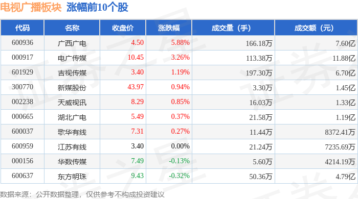 | 代码 | 名称 | 收盘价 | 涨跌幅 | 成交量(手) | 成交额(元) | | --- | --- | --- | --- | --- | --- | | 920021 | 流金科技 | 6.91 | 5.02% | 21.65万 | 1.48亿 | | 600996 | 贵广网络 | 10.94 | 2.63% | 29.10万 | 3.21亿 | | 300770 | 新媒股份 | 43.56 | 1.18% | 2.09万 | 9111.80万 | | 000917 | 电广传媒 | 10.12 | 1.00% | 1 77.81万 | 7.86亿 | | 002238 | 天威视讯 | 8.22 | 0.98% | 15.16万 | 1.24亿 | | 000156 | 化数传媒 | 7.50 | 0.67% | 5.86万 | 4388.59万 | | 600637 | 东方明珠 | 9.46 | 0.32% | 35.17万 | 3.31亿 | | 601929 | 吉视传媒 | 3.36 | 0.30% | 83.83万 | 2.81亿 | | 600959 | 江苏有线 | 3.40 ...
