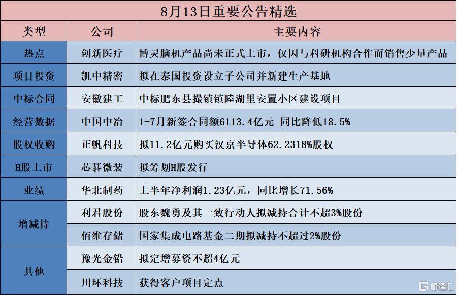 热点公告 - 创新医疗博灵脑机产品尚未正式上市 仅因与科研机构合作销售少量产品 [1] - 吉视传媒不参与投资目前上映的影片 [1] 项目投资 - 凯中精密拟在泰国投资设立子公司并新建生产基地 [1] 中标合同 - 安徽建工中标肥东县撮镇镇睦湖里安置小区建设项目 [1] - 大禹节水联合体中标晋宁区滇池流域深化农业水价综合改革及现代化灌区-再生水利用项目 [1] 经营数据 - 中国中冶1-7月新签合同额6113.4亿元 同比降低18.5% [1] 股权收购 - 正帆科技拟11.2亿元购买汉京半导体62.2318%股权 [1] H股上市 - 芯碁微装拟筹划H股发行 [1] 业绩公告 - 华北制药上半年净利润1.23亿元 同比增长71.56% [1] - 有研硅上半年净利润1.06亿元 同比下降18.74% [1] - 哈投股份上半年净利润3.8亿元 同比增长233.08% [1] - 兖矿能源预计半年度净利润同比减少38%左右 [1] 股东增减持 - 宇环数控控股股东许世雄拟减持不超1%股份 [1] - 天利科技股东钱永耀拟减持不超3%股份 [1] - 利君股份股东魏勇及其一致行动人拟减持合计不超3%股份 [1] - 佰维存储国家集成电路基金二期拟减持不超过2%股份 [1] 其他重大事项 - 豫光金铅拟定增募资不超4亿元 [2] - 川环科技获得客户项目定点 [2]