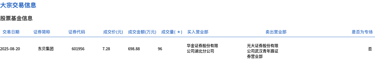 交易概况 - 东贝集团于8月20日发生大宗交易,成交量为96万股,成交金额为698.88万元,占当日总成交额的3.56% [1] - 成交价格为7.28元,较市场收盘价7.43元折价2.02% [1] 交易细节 - 证券代码为eo195e,交易日期为2025年8月20日 [2] - 买入营业部为华金证券股份有限公司,卖出营业部为光大证券股份有限公司武汉青年路证券营业部 [2] - 交易涉及湖北地区营业部参与 [2]