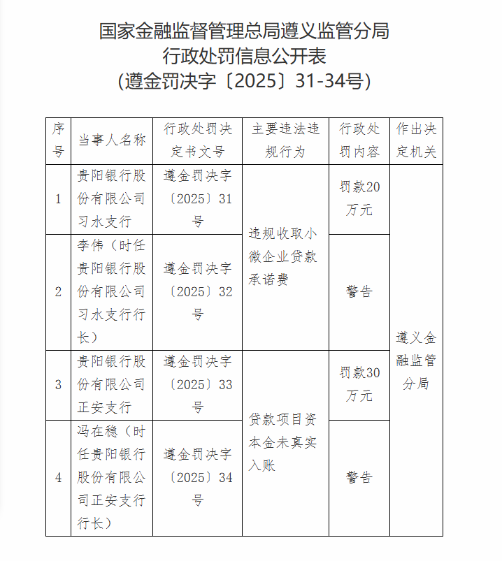公司监管处罚 - 贵阳银行习水支行因违规收取小微企业贷款承诺费被国家金融监督管理总局贵州监管局处以20万元罚款 时任该支行行长李伟被警告 [1] - 贵阳银行正安支行因贷款项目资本金未真实入账被处以30万元罚款 时任该支行行长冯在稳被警告 [1] 行业监管动态 - 国家金融监督管理总局地方监管局对银行机构在服务小微企业及贷款管理方面的违规行为进行查处并披露处罚结果 [1]