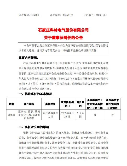 核心事件概述 - 科林电气董事长陈维强因个人原因辞去公司董事长、董事及董事会专门委员会相关职务 [1][5] - 辞职生效后,在新任董事就任前,陈维强将继续履行董事、战略委员会主席及审计委员会委员职责 [5][9] - 公司全体董事一致推举副董事长史文伯代为履行董事长职责,直至选举产生新任董事长 [5][9] 人事变动详情 - 辞职人员:陈维强 [1][3][5][7] - 辞任职务:第五届董事会董事长、董事、战略委员会主席、审计委员会委员 [1][3][5][7] - 原定任期截止日:2027年8月29日 [3][7] - 辞任原因:个人原因 [1][3][5][7] - 辞任后是否继续在上市公司及其控股子公司任职:否 [3][7] - 是否存在未履行完毕的公开承诺:否 [3][7] 公司治理安排 - 因辞职导致董事会及专门委员会成员低于章程规定人数,需依法补选 [5][9] - 陈维强辞职生效后,其董事及专门委员会职责将延续至补选出的董事就任之日 [5][9] - 董事长职责由副董事长史文伯代为履行,代行期限自辞职生效日起至新任董事长选举产生止 [5][9]