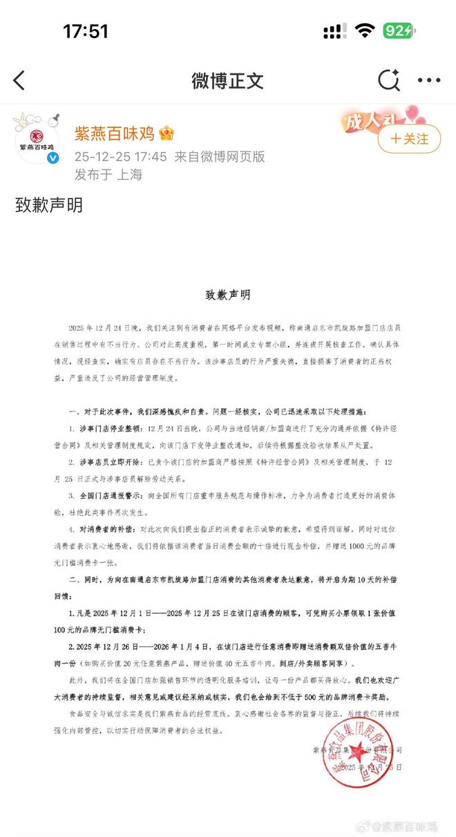 2. 涉事店员立即开除:已责令该门店的加盟商严格按照《特许经营合同》及相关管理制度,于 12. 月 25 日正式与涉事店员解除劳动关系。 3. 全国门店通报警示:向全国所有门店重申服务规范与操作标准,力争为消费者打造更好的消费体 验,杜绝此类事件再次发生。 4. 对消费者的补偿:对此次向我们提出指正的消费者表示诚挚的歉意,希望得到谅解。同时对这位 消费者表示衷心地感谢,我们将依据该消费者当日消费金额的十倍进行现金补偿,并赠送1000元的品牌 无门槛消费卡一张。 二、同时,为向在南通启东市凯旋路加盟门店消费的其他消费者表达歉意,将开启为期10天的补偿 回馈: 新京报讯12月25日,紫燕百味鸡官博发布致歉声明,内容如下: 致歉声明 2025年12月24日晚,我们关注到有消费者在网络平台发布视频,称南通启东市凯旋路加盟门店店员 在销售过程中有不当行为。公司对此高度重视,第一时间成立专案小组,并连夜开展核查工作,确认具体 情况,现经查实,确实有店员存在不当行为。该涉事店员的行为严重失德,直接损害了消费者的正当权 益,严重违反了公司的经营管理制度。 一、对于此次事件,我们深感愧疚和自责。问题一经核实,公司已迅速采取以下 ...