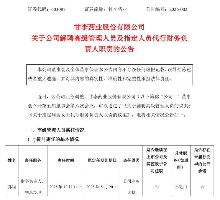 2026年1月1日,上交所主板上市公司甘李药业(603087.SH)发布了《关于公司解聘高级管理人员及指定人员代行财务负责人职 责的公告》。公告显示,因公司业务调整,公司董事会同意解除孙程先生的财务负责人和副总经理职务,孙程先生离职后不再 担任公司任何职务。本次解聘事项,是基于公司创新药研发、营销及投融资业务全球化升级的战略需要,而实施的高级管理人 员优化调整举措。 截至该公告披露日,孙程先生作为公司2022年限制性股票激励计划和2024年限制性股票激励计划的激励对象,持有已解除限售 的限制性股票18.22万股(注:按2025年12月31日收盘价68.07元/股计算,孙程先生持股市值约1,240万元);已获授但尚未解除限 售的限制性股票共计32.8万股,根据公司规定,该部分已获授但尚未解除限售的限制性股票不得解除限售,由公司以授予价格 (扣除已分配股利)进行回购注销。 被解聘财务负责人孙程简历如下: 孙程,1979年出生,澳洲注册会计师,硕士研究生,毕业于清华大学。2003年至2010年,任职于毕马威华振会计师事务所,担 任审计经理;2010年至2018年,任职于亚美能源控股有限公司(2686.hk),担任财 ...