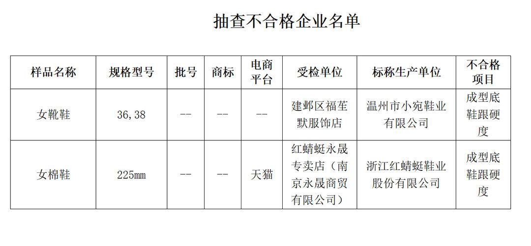 监管抽查结果 - 南京市市场监管局发布棉鞋产品监督抽查结果 共抽取10批次样品 经检验有2批次不合格 不合格发现率为20% [1][4] - 不合格项目均为成型底鞋跟硬度 一批次为跟高>50mm的不发泡材料棉鞋 硬度应≥70邵尔A 实测小于70邵尔A 另一批次为跟高>50mm的发泡材料棉鞋 硬度应≥75邵尔C 实测小于75邵尔C [4] 不合格产品与企业信息 - 不合格样品一为“女靴鞋” 规格型号36 38 商标为“F” 电商平台为“2005” 受检单位为建邺区福笙默服饰店 标称生产单位为温州市小宛鞋业有限公司 [3] - 不合格样品二为“女棉鞋” 规格225mm 电商平台为天猫 受检单位为红蜻蜓永晟专卖店(南京永晟商贸有限公司) 标称生产单位为浙江红蜻蜓鞋业股份有限公司 [3] 不合格原因与影响 - 成型底鞋跟硬度是鞋底跟部抵抗硬物压入其表面的能力 不合格会直接影响穿鞋体验与足部健康 [1][4] - 主要影响体现在支撑不足 易磨损 寿命短 安全性下降 [1][4] - 项目不合格的主要原因是制作鞋子所选用的材质较差 配方 工艺等不过关 [4] 消费选购建议 - 建议消费者通过大型商场 专卖店或知名品牌官方旗舰店等渠道 选购正规厂家生产的产品 以避免购入“三无”产品 [6] - 选购时可触摸感受鞋内底是否平整 主跟和包头部分是否圆顺无毛刺 如条件允许 建议实际试穿并进行行走体验 重点注意前脚掌是否感到挤压或存在其他明显不适 [6] - 通过电商平台购买 收到货物后应及时验货 重点核对产品信息是否与商家网页描述一致 同时确认吊牌和标识中是否清晰标注厂名 厂址 所执行的产品标准 以及材质 颜色与鞋号等基本信息 如缺乏上述信息 建议谨慎购买 [6] 产品使用与养护 - 日常穿着应定期清洁 鞋面可使用软毛刷蘸取中性清洁剂轻柔刷洗 鞋内棉绒鞋垫可取出晾晒(避免阳光直射) 确保干燥卫生 [7] - 棉鞋遇水后易发生变形及霉变 雨天应尽量避免穿着 若不慎沾水 应立即以干布吸干水分 并置于通风处阴干 切忌暴晒或使用吹风机直接吹干 [7] - 长期不穿着时 应先行清洁并彻底晾干 随后在鞋腔内填入鞋撑或报纸以维持鞋型 再将其置于透气鞋袋中 储存于干燥 阴凉且通风良好的环境中 并避免与潮湿或尖锐物品接触 [7]