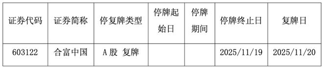 (文章来源:证券日报) 证券日报网讯 11月19日晚间,合富中国发布公告称,自2025年10月28日至2025年11月14日期间,公司 股票连续十四个交易日中有十二个交易日以涨停价收盘,并5次触及股价异常波动、3次触及严重异常波 动情形,期间累计涨幅高达256.29%,已明显高于同期行业及上证指数涨幅。股价短期内连续上涨,存 在市场情绪过热、非理性炒作风险,随时存在快速下跌可能。为维护广大投资者利益,根据相关规定, 经向上海证券交易所申请,本公司股票于2025年11月17日(星期一)开市起停牌,预计停牌时间不超过 3个交易日,公司股票将自披露核查公告后复牌。近期,公司就股票交易异常波动及严重异常波动的相 关事项进行了核查。鉴于相关核查工作已完成,经公司向上海证券交易所申请,公司股票将于2025年11 月20日(星期四)开市起复牌。 ...