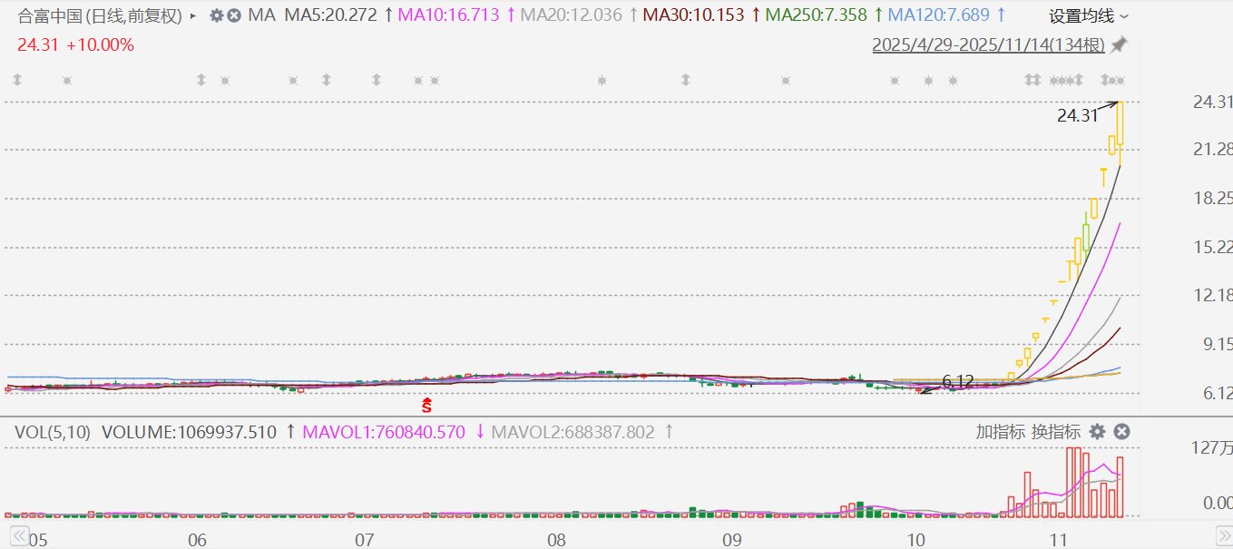 昨日晚间,合富中国公告,公司股票价格于2025年10月28日至11月13日连续十三个交易日累计涨幅达到230.84%,公司股票流通换手率亦出现较大波 动情形,击鼓传花效应明显,投资者参与交易可能面临较大风险。如公司股价进一步异常上涨,公司可能申请停牌核查。 11月14日,合富中国尾盘涨停,走出14天13板,成交额超24亿元。 编辑丨瑜见 ...