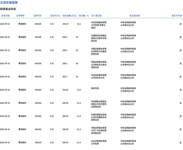 大宗交易概况 - 腾龙股份于2025年9月10日发生大宗交易,成交251.2万股,成交金额2348.73万元,占当日总成交额的5.32% [1] - 成交价格为9.35元,较市场收盘价10.58元折价11.63% [1] 交易明细分析 - 所有交易均通过中信证券常州分公司作为卖出方,买入方包括中信证券总部、中国银河证券金华营业部、华泰证券南京大光路营业部等多家券商分支机构 [2] - 单笔最大成交量为32.1万股,金额300.14万元,由中信证券股份有限公司总部买入 [2] - 机构专用席位参与买入21.5万股,金额201.03万元 [2] - 交易价格全部统一为9.35元,未出现价格差异 [2] 交易结构特征 - 卖出营业部高度集中,全部来自中信证券常州分公司 [2] - 买入营业部地域分布广泛,包括北京、南京、广州、西安、温州等多个城市 [2] - 交易是否为专场标志存在不同标注,包括"180"、"Ka"、"蓝"、"香"、"星"、"중"等多种标识 [2]