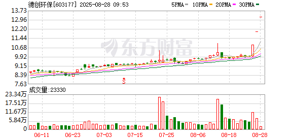德创环保涨停,龙虎榜上机构买入613.53万元,卖出224.19万元