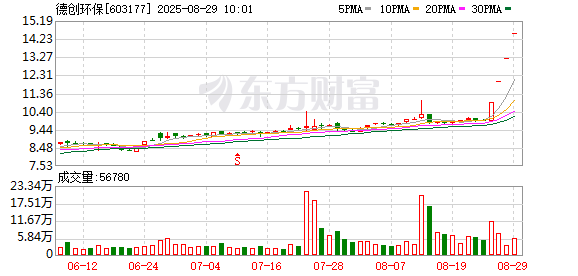 股价表现 - 德创环保盘中涨停 已连续4个交易日涨停 最新股价报14.50元[2] - 连续涨停期间累计上涨46.46% 累计换手率达12.99%[2] - 最新A股总市值29.89亿元 A股流通市值29.61亿元[2] 交易数据 - 当日换手率1.93% 成交量394.16万股 成交金额5715.31万元[2] - 涨停板封单金额达5.41亿元[2] - 主力资金连续三日净流入 8月26日净流入5377.51万元 8月27日净流入3407.11万元 8月28日净流入2450.29万元[2] 龙虎榜数据 - 因连续三个交易日内涨幅偏离值累计达20%及日涨幅偏离值达7% 两次上榜龙虎榜[2] - 机构净买入389.34万元 营业部席位合计净买入3270.23万元[2] 财务表现 - 上半年实现营业总收入4.92亿元 同比增长11.24%[2] - 上半年实现净利润0.17亿元 同比下降14.47%[2]