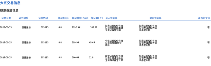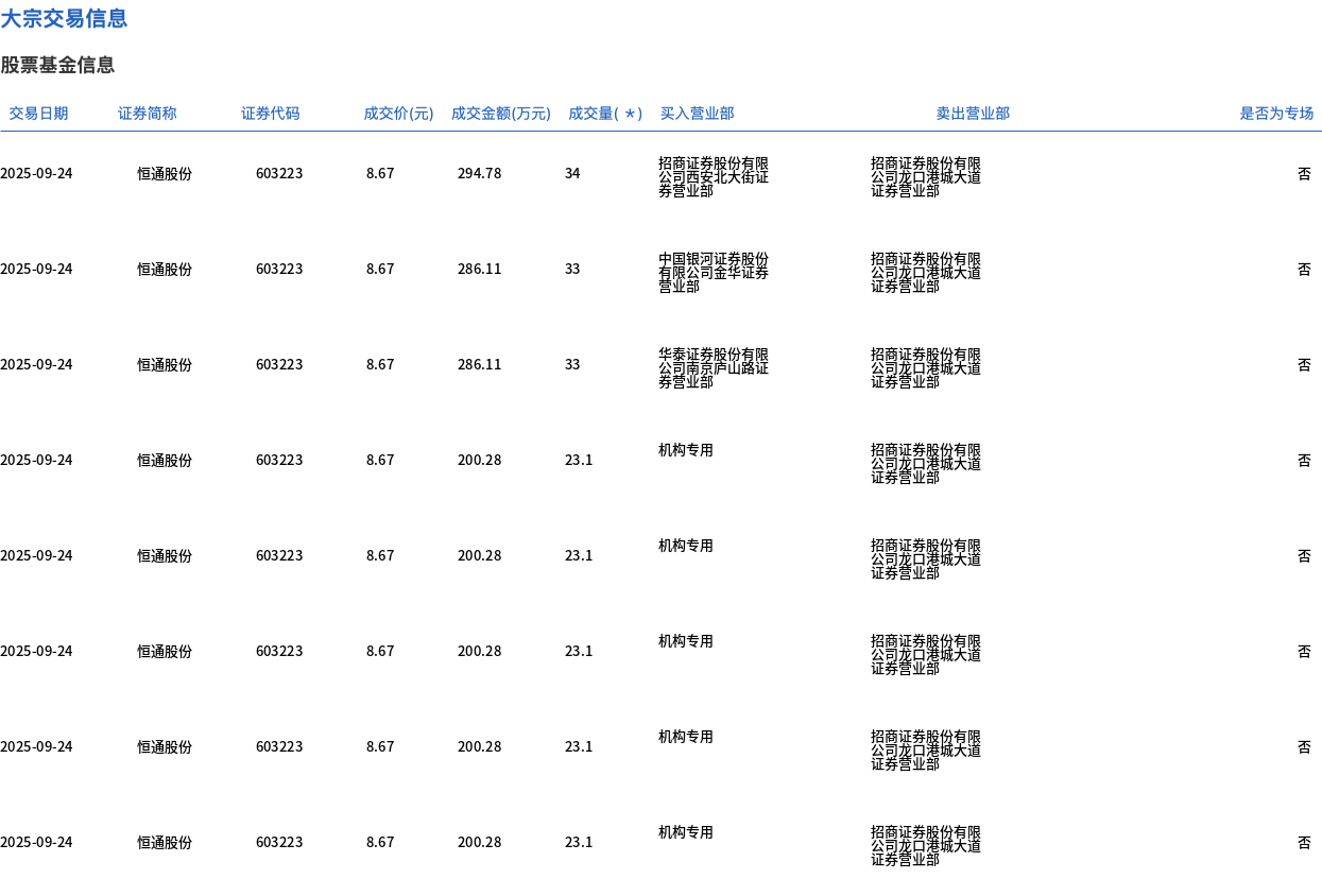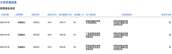 9月30日,恒通股份大宗交易成交114万股,成交额990.66万元,占当日总成交额的15.76%,成交价8.69 元,较市场收盘价9.77元折价11.05%。 | 交易日期 | 证券简称 | 证券代码 | | | 成交价(元) 成交金额(万元) 成交量(*) 买入营业部 | | 卖出营业部 | 是否为专场 | | | --- | --- | --- | --- | --- | --- | --- | --- | --- | --- | | 2025-09-30 | 但通股份 | 603223 | 8.69 | 399.74 | 46 | 公司有名器控有限 | 2016 11:23 | | Ka | | 2025-09-30 | 但通股份 | 603223 | 8.69 | 295.46 | 34 | 参景中营米铁路透 | 品番号為電話 | | KI | | 2025-09-30 | 但通常的份 | 603223 | 8.69 | 295.46 | 34 | 福昌美容認定對薩 | 器量是含量感染器 | | Ka | ...