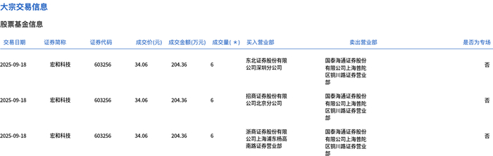 大宗交易概况 - 2025年9月18日宏和科技发生大宗交易成交18万股 成交总额613.08万元 占当日总成交额0.33% [1] - 成交价格34.06元 较当日市场收盘价40.1元折价15.06% [1] 交易明细结构 - 共3笔交易 单笔成交量均为6万股 单笔成交金额均为204.36万元 [2] - 买方营业部分别为东北证券深圳分公司 招商证券北京分公司和浙商证券上海浦东杨赢路营业部 [2] - 卖方营业部均为国泰海通证券上海普陀区铜川路营业部 [2] 价格与流动性特征 - 大宗交易成交价34.06元显著低于市场价 折价幅度超15% [1][2] - 大宗交易额占全日总成交额比例较低 仅0.33% 对二级市场流动性影响有限 [1]