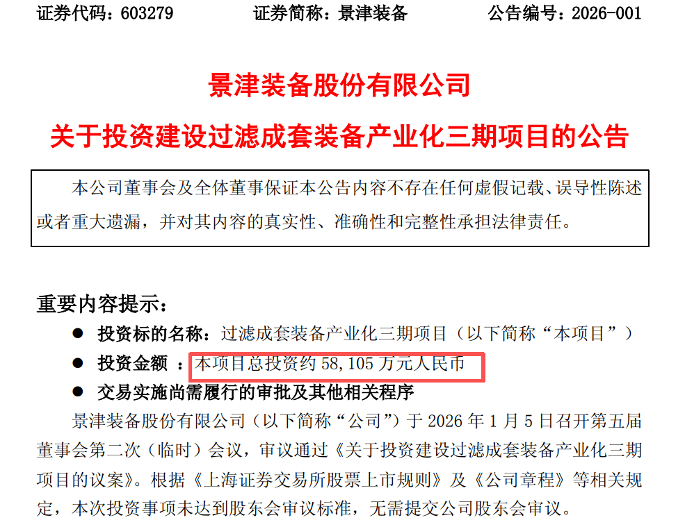 投资概述 - 景津装备股份有限公司计划投资建设过滤成套装备产业化三期项目 总投资额约为58,105万元人民币 [1][3][4] - 该项目已通过公司第五届董事会第二次(临时)会议审议 无需提交股东会审议 [1][4] - 本次投资不构成关联交易及重大资产重组 [4] 项目详情 - 项目位于德州天衢新区 公司为项目实施主体 [3][4] - 项目目前处于前期筹备阶段 已取得项目用地并完成备案及环评 尚未开始建设 [6] - 项目资金将全部来源于公司自有资金 不涉及募集资金 [9] 战略定位与产品 - 项目是公司从单一压滤机制造商向过滤成套装备制造商战略转型的关键举措 [3] - 生产产品包括MVR蒸发器、多效蒸发器、反应釜、各类塔器、换热器及多种工业罐体等 [3][7] - 新产品可与公司现有压滤机产品配套使用 形成兼顾固液分离、能耗优化与资源回收的综合解决方案 [3][7] 市场与可行性 - 项目产品广泛应用于矿物加工、环境保护、新能源、新材料、生物医药、化工等主流及新兴领域 [7] - 项目旨在提高公司设备集成和整体方案解决能力 依托现有客户资源拓展国内外市场 [7] - 项目符合国家产业政策 顺应下游行业对节能、环保和资源利用提升的需求 技术、生产及客户资源为项目实施提供了支撑 [9] 对公司的影响 - 项目有助于优化公司产能布局 提升产能 巩固和增强行业领先地位及竞争力 [9] - 公司财务状况稳定良好 以自有资金分期投入 预计不会对财务及经营状况产生重大影响 [10]