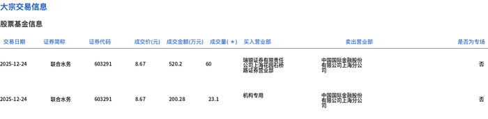 12月24日,联合水务大宗交易成交83.1万股,成交额720.48万元,占当日总成交额的25.01%,成交价 8.67元,较市场收盘价9.7元折价10.62%。 | 交易日期 | 证券简称 | 证券代码 | | | 成交价(元) 成交金额(万元) 成交量( *) 买入营业部 | | 类出营业部 | 是否为专场 | | | --- | --- | --- | --- | --- | --- | --- | --- | --- | --- | | 2025-12-24 | 联合水务 | 603291 | 8.67 | 520.2 | 60 | ្រីក៏ទឹកនឹងទឹង | 去園園筒主婦努怒 | | 客 | | 2025-12-24 | 联合水务 | 603291 | 8.67 | 200.28 | 23.1 | 机构专用 | 芽圓恐筒主赌劈型 | | Ka | ...