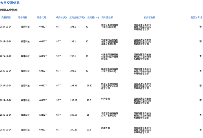12月24日,福蓉科技大宗交易成交220.82万股,成交额2157.39万元,占当日总成交额的4.83%,成交价 9.77元,较市场收盘价11.13元折价12.22%。 | 交易日期 | 证券简称 | 证券代码 | | | 成交价(元) 成交金额(万元) 成交量(*) 买入营业部 | | 类出管业部 | 是否为专场 | | --- | --- | --- | --- | --- | --- | --- | --- | --- | | 2025-12-24 | 搞梦科技 | 603327 | 9.77 | 293.1 | 30 | 公司系照分公司限 | 看度之一篇: | KA | | 2025-12-24 | 福零科技 | 603327 | 9.77 | 293.1 | 30 | | 看魔公司 福州路 | Ka | | 2025-12-24 | 福营科技 | 603327 | 9.77 | 293.1 | 30 | 有關交易委委员会 | 有限公司 1988 | 질 | | 2025-12-24 | 福营科技 | 603327 | 9.77 | 293.1 | 30 | 型号线索的公司 | 有限公司 福州移桥 | ...