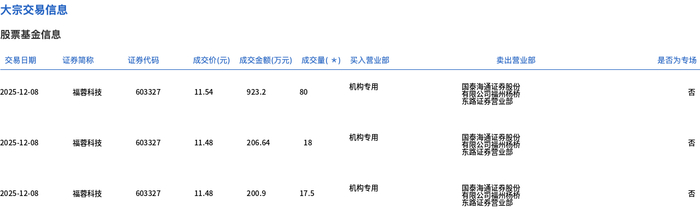 大宗交易概况 - 2025年12月8日,福蓉科技发生大宗交易,总成交115.5万股,总成交金额1330.74万元,占当日总成交额的0.62% [1] - 大宗交易成交均价为11.52元,较当日市场收盘价13.58元折价15.16% [1] - 交易价格区间在11.48元至11.54元之间 [1] 交易明细分析 - 当日共发生三笔大宗交易,证券代码均为603327 [2] - 第一笔成交价为11.54元,成交金额923.2万元,成交量80万股,买入方为机构专用 [2] - 第二笔成交价为11.48元,成交金额206.64万元,成交量18万股,买入方为机构专用 [2] - 第三笔成交价为11.48元,成交金额200.9万元,成交量17.5万股,买入方为机构专用 [2]