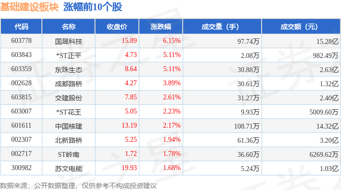 证券之星消息,12月25日基础建设板块较上一交易日上涨0.45%,国晟科技领涨。当日上证指数报收于 3959.62,上涨0.47%。深证成指报收于13531.41,上涨0.33%。基础建设板块个股涨跌见下表: | 代码 | 名称 | 收盘价 | 涨跌幅 | 成交量(手) | 成交额(元) | | --- | --- | --- | --- | --- | --- | | 603778 | 国晟科技 | 15.89 | 6.15% | 97.74万 | 15.28亿 | | 603843 | *ST正平 | 4.73 | 5.11% | 2.08万 | 982.49万 | | 603359 | 东珠生态 | 8.64 | 5.11% | 30.88万 | 2.63亿 | | 002628 | 成都路桥 | 4.27 | 3.89% | 30.61万 | 1.32亿 | | 603815 | 交建股份 | 7.85 | 2.61% | 31.27万 | 2.40亿 | | 603007 | *ST花王 | 5.05 | 2.23% | 9.93万 | 5009.60万 | | 601611 | 中国核建 | 13 ...