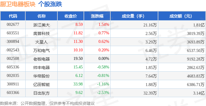 厨卫电器板块市场表现 - 2023年12月29日,厨卫电器板块整体下跌0.32%,表现弱于上证指数(上涨0.04%),但强于深证成指(下跌0.49%)[1] - 板块内个股表现分化,浙江美大领涨,涨幅为1.54%,收盘价8.59元;日出东方领跌,跌幅为2.53%,收盘价9.62元[1] - 板块当日总成交额活跃,其中日出东方成交额最高,达3.14亿元,成交量32.39万手;浙江美大成交额次之,为1.81亿元,成交量21.16万手[1] 厨卫电器板块资金流向 - 板块整体呈现主力资金净流出状态,当日主力资金净流出5763.48万元[1] - 游资与散户资金呈现净流入,其中游资资金净流入371.25万元,散户资金净流入5392.23万元[1] - 个股资金流向差异显著,老板电器主力资金净流入最多,为729.19万元,主力净占比7.93%;日出东方主力资金净流出最多,达5762.18万元,主力净占比-18.33%[2] - 在散户资金流向方面,日出东方净流入最多,为5567.17万元,散户净占比17.71%;奥普科技净流出最多,为426.34万元,散户净占比-14.12%[2]