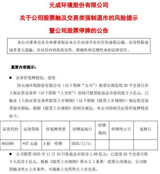 公司退市触发事件 - 公司股票因连续20个交易日收盘总市值低于人民币5亿元,触及交易类强制退市指标 [1] - 公司股票自2025年11月11日起停牌,上海证券交易所将在5个交易日内发出拟终止上市的事先告知书 [1] - 公司证券代码为603388,证券简称为*ST元成,停牌类型为A股停牌 [4] 二级市场表现 - 公司股价在触发退市当日一字跌停,收盘价为人民币0.58元 [4] - 公司股票停牌时总市值为人民币1.89亿元,远低于5亿元的退市门槛 [4]