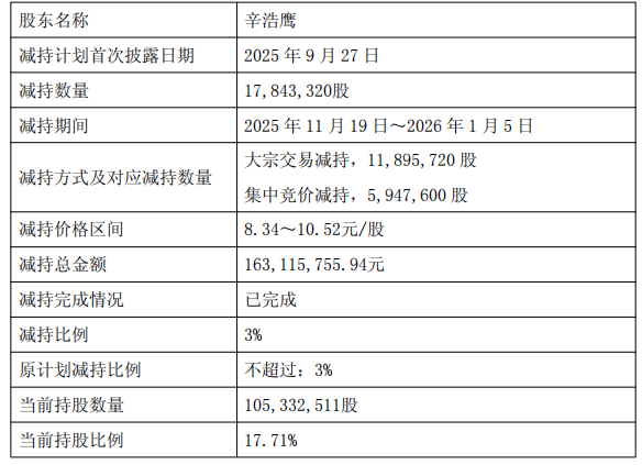 股东减持 - 辛浩鹰减持前持股123,175,831股,比例20.71%[5] - 截至披露日持股105,332,511股,比例17.71%[5][6] - 2025年9月27日披露减持计划[5][6] - 减持17,843,320股,比例3%[6] - 减持价格8.34 - 10.52元/股,金额163,115,755.94元[6] - 减持期2025年11月19日 - 2026年1月5日[6] 一致行动人持股 - 李晖、辛浩鹰等一致行动人合计持股262,931,461股,比例44.20%[7]
