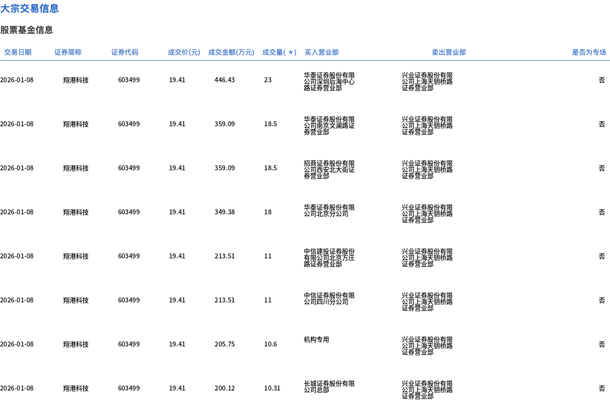 1月8日,翔港科技大宗交易成交120.91万股,成交额2346.88万元,占当日总成交额的7.37%,成交价19.41元,较市场收盘价21.87元折价11.25%。 | 交易日期 | 证券简称 | 证券代码 | 成交价(元) | 成交金额(万元) | 成交量(*) 买入营业部 | | 卖出营业部 | | --- | --- | --- | --- | --- | --- | --- | --- | | 2026-01-08 | 翔港科技 | 603499 | 19.41 | 446.43 | 23 | | 美國音 | | 2026-01-08 | 翔港科技 | 603499 | 19.41 | 359.09 | 18.5 | | | | 2026-01-08 | 翔港科技 | 603499 | 19.41 | 359.09 | 18.5 | | | | 2026-01-08 | 翔港科技 | 603499 | 19.41 | 349.38 | 18 | 华泰证券股公司限 | 表遺言語 | | 2026-01-08 | 翔港科技 | 603499 | 19.41 | 213.51 | II | | | | 20 ...
