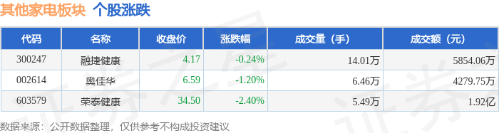 | 代码 | | | 名称 主力净流入(元) 主力净占比 游资净流入(元) 游资净占比 散户净流)(元) 散户净占比 | | | | | --- | --- | --- | --- | --- | --- | --- | | 002614 奥佳华 | -96.26万 | -2.25% | 212.13万 | 4.96% | -115.87万 | -2.71% | | 603579 荣泰健康 | -597.45万 | -3.12% | -503.17万 | -2.63% | 1100.62万 | 5.75% | | 300247 融捷健康 | -606.52万 | -10.36% | 448.43万 | 7.66% | 158.10万 | 2.70% | 证券之星消息,9月30日其他家电板块较上一交易日下跌1.6%,荣泰健康领跌。当日上证指数报收于 3882.78,上涨0.52%。深证成指报收于13526.51,上涨0.35%。其他家电板块个股涨跌见下表: | 代码 | 名称 | 收盘价 | 涨跌幅 | 成交量(手) | 成交额(元) | | | --- | --- | --- | --- | --- | -- ...