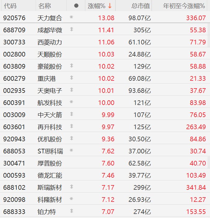 截至发稿,神剑股份6连板,广联航空、 博云新材、隆基机械、长江通信、 天奥电子、 再升科技等多 股涨停,航天软件、超捷股份涨超10%。 | 代码 | 名称 | 涨幅%v | 现价 | | --- | --- | --- | --- | | 300900 | 广联航空 | +19.99% | 31.21 | | 301005 | 超捷股份 | +14.56% | 128.81 | | 688562 | 航天软件 | +13.61% | 23.46 | | 688270 | 臻镭科技 | +13.02% | 129.07 | | 002297 | 博云新材 | +10.04% | 12.39 | | 002363 | 隆基机械 | +10.03% | 10.31 | | 000551 | 创元科技 | +10.03% | 16.68 | | 002361 | 神剑股份 | +10.02% | 11.97 | | 600345 | 长江通信 | +10.02% | 32.73 | | 003007 | 直真科技 | +10.01% | 39.01 | | 002935 | 天奥电子 | +10.01% | 22.0 ...