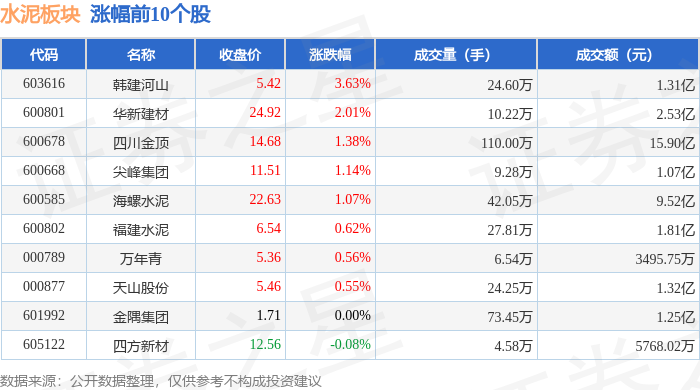 市场表现 - 1月7日,水泥板块整体上涨0.46%,表现强于大盘,当日上证指数上涨0.05%,深证成指上涨0.06% [1] - 板块内个股表现分化,韩建河山领涨,涨幅为3.63%,收盘价5.42元,华新建材上涨2.01%,四川金顶上涨1.38% [1] - 部分个股下跌,上峰水泥跌幅最大,为-1.97%,收盘价12.95元,烘脂屋使下跌-1.76%,宁夏建材下跌-1.11% [2] 个股交易数据 - 海螺水泥成交额最高,达9.52亿元,成交量42.05万手,收盘价22.63元,上涨1.07% [1] - 四川金顶成交量最大,为110.00万手,成交额206亿元(注:原文为206'SI,疑似笔误,按上下文应为亿元),收盘价14.68元 [1] - 华新建材成交额2.53亿元,成交量10.22万手,韩建河山成交额1.31亿元,成交量24.60万手 [1] 资金流向 - 当日水泥板块整体呈现主力资金和游资净流出,散户资金净流入,主力资金净流出470.7万元,游资资金净流出2014.99万元,散户资金净流入2485.69万元 [2] - 海螺水泥获得主力资金净流入最多,达7421.65万元,主力净占比7.80%,但其游资和散户资金均为净流出 [3] - 韩建河山主力资金净流入2747.84万元,主力净占比高达21.01%,在板块个股中占比最高 [3] - 万年青主力资金净流入800.22万元,主力净占比达22.89%,在板块个股中净流入占比最高 [3]
