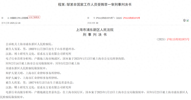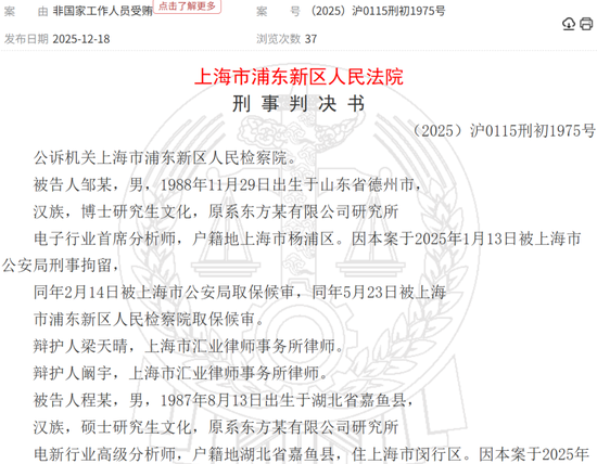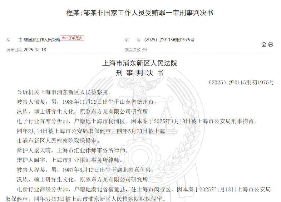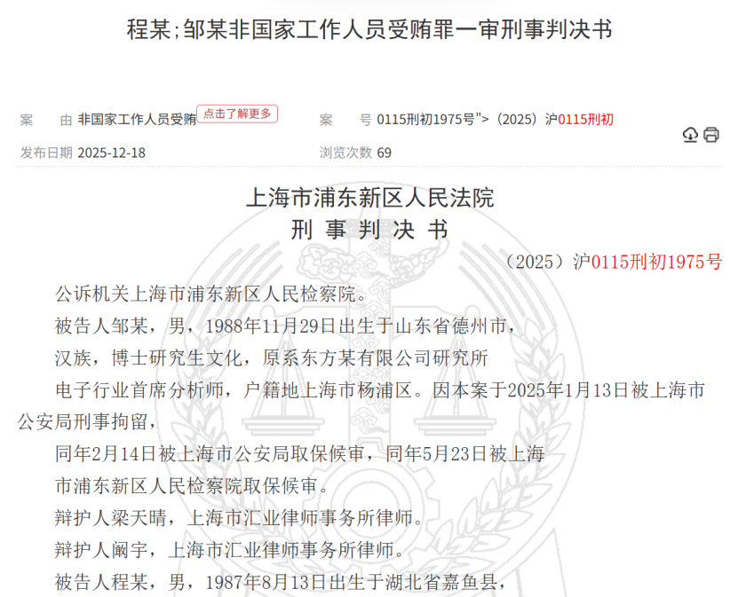 炒股就看金麒麟分析师研报,权威,专业,及时,全面,助您挖掘潜力主题机会! 来源:财通社 据中国裁判文书网12月18日披露的一份刑事判决书,一起券商分析师有偿撰写研报的案件近日尘埃落 定。 判决书显示,上海市浦东新区人民法院7月份就该案作出一审判决。 | 案 由 非国家工作人员受贿 点击了解更多 案 号 (2025) 沪0115刑初1975号 | | 中日 | | --- | --- | --- | | 发布日期 2025-12-18 | 浏览次数 37 | | 涉案被告之一邹某,男,1988年11月出生,博士研究生学历,原系东方某有限公司(下称"东方某公 司")研究所电子行业首席分析师。 另一名被告程某,男,1987年8月出生,硕士研究生学历,原系东方某公司研究所电新行业高级分析 师。 因涉嫌非国家工作人员受贿罪,邹某于今年1月13日被上海市公安局刑事拘留,后分别于2月14日、5月 23日由公安机关和检察机关取保候审。 程某则于1月13日被公安机关取保候审,并于5月23日被检察机关取保候审。 法院查明,2023年4月,邹某、程某接受宋某甲(另案处理)请托,利用邹某担任东方某公司研究所电 子行业首席分析师的职务 ...