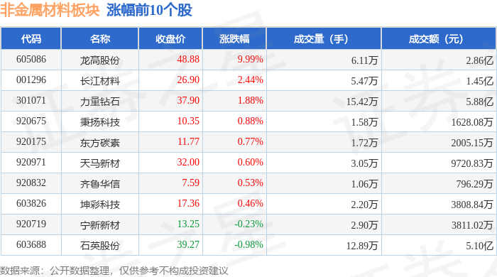 证券之星消息,1月8日非金属材料板块较上一交易日下跌0.31%,联瑞新材领跌。当日上证指数报收于 4082.98,下跌0.07%。深证成指报收于13959.48,下跌0.51%。非金属材料板块个股涨跌见下表: | 代码 | 名称 | 收盘价 | 涨跌幅 | 成交量(手) | | 成交额(元) | | | --- | --- | --- | --- | --- | --- | --- | --- | | 605086 | 龙高股份 | 48.88 | 9.99% | | 6.11万 | | 2.86亿 | | 001296 | 长江材料 | 26.90 | 2.44% | | 5.47万 | 1.45亿 | | | 301071 | 力量钻石 | 37.90 | 1.88% | | 15.42万 | | 5.88 (Z | | 920675 | 秉扬科技 | 10.35 | 0.88% | | 1.58万 | 1628.08万 | | | 920175 | 东方恢袁 | 11.77 | 0.77% | | 1.72万 | 2005.15万 | | | 920971 | 天马新材 | 32.00 | 0.60% ...