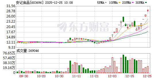 证券代码:603696 证券简称:安记食品 公告编号:2025-056 安记食品股份有限公司 关于股票交易风险提示公告 截至 2025 年 12 月 24 日,公司所处调味品行业平均市盈率为 31.90 倍,公 司当前市盈率为 157.11 倍,显著高于同行业水平。公司股票 2025 年 12 月 19 日、 12 月 22 日、12 月 23 日和 12 月 24 日换手率分别为 21.03%、20.75%、7.04%和 安记食品股份有限公司(以下简称"本公司"或者"公司")股票于 2025 年 12 月 19 日、12 月 22 日和 12 月 23 日连续三个交易日内收盘价格涨 幅偏离值累计超过 20%,根据《上海证券交易所交易规则》的有关规定, 属于股票交易异常波动情形。公司已于 2025 年 12 月 24 日在上海证券 交易所网站披露了《关于股票交易异常波动公告》(公告编号:2025-055)。 2025 年 12 月 24 日,公司股票继续涨停。鉴于近期公司股票交易价格波 动较大,截至 2025 年 12 月 24 日公司市盈率为 157.11 倍,公司所处调 味品行业平均市盈率为 31.90 ...