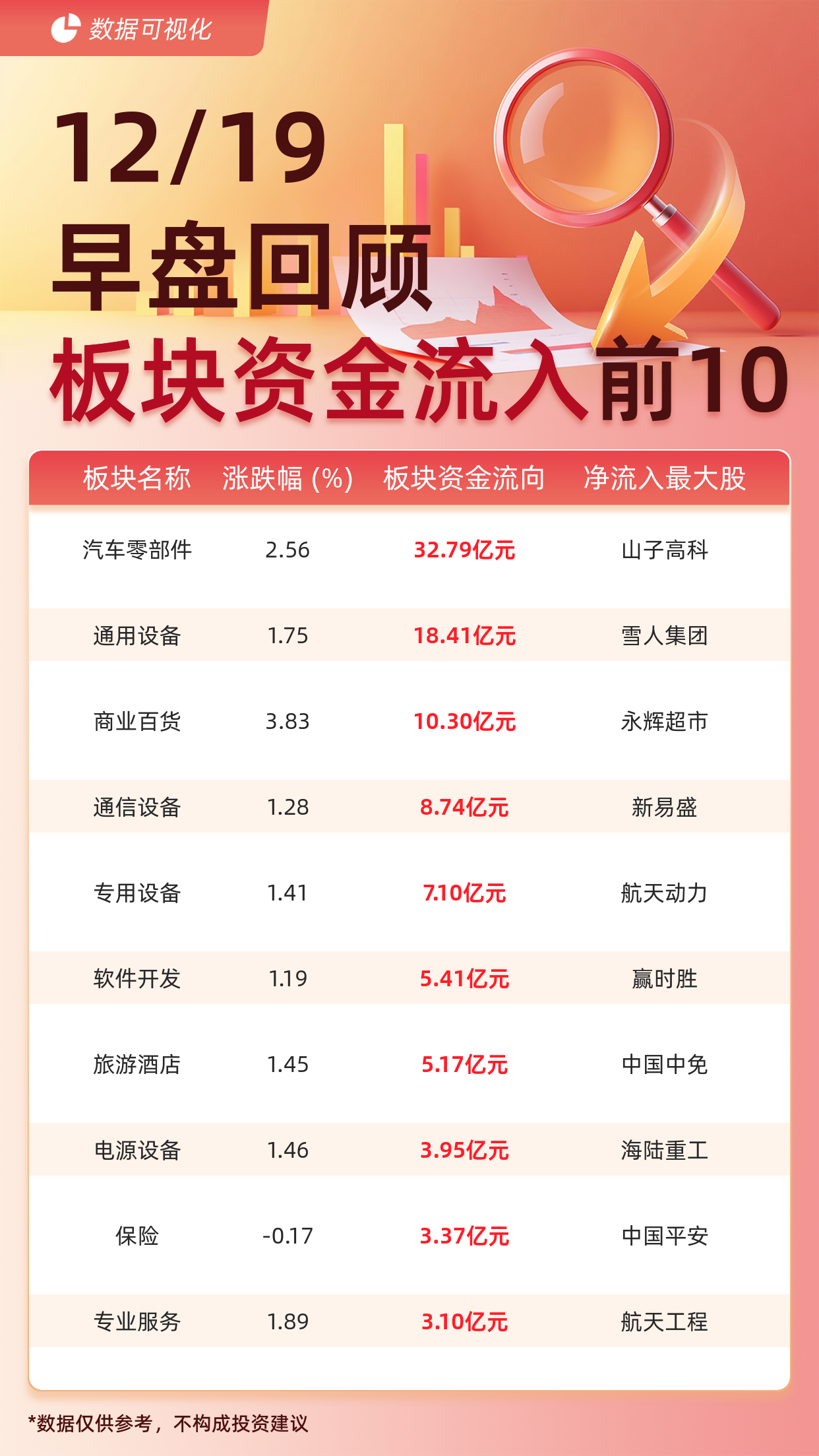 市场整体资金流向 - 截至12月19日午间收盘,大盘主力资金整体呈现净流入状态,净流入额为10.42亿元 [1] 行业板块资金流入排名 - 汽车零部件板块获得主力资金净流入32.79亿元,位列第一,板块当日涨跌幅为2.56% [1][2] - 通用设备板块获得主力资金净流入18.41亿元,位列第二,板块当日涨跌幅为1.75% [1][2] - 商业百货板块获得主力资金净流入10.30亿元,位列第三,板块当日涨跌幅为3.83% [1][2] - 通信设备板块获得主力资金净流入8.74亿元,位列第四,板块当日涨跌幅为1.28% [1][2] - 专用设备板块获得主力资金净流入7.10亿元,位列第五,板块当日涨跌幅为1.41% [1][2] - 软件开发板块获得主力资金净流入5.41亿元,位列第六,板块当日涨跌幅为1.19% [1][2] - 旅游酒店板块获得主力资金净流入5.17亿元,位列第七,板块当日涨跌幅为1.45% [1][3] - 电源设备板块获得主力资金净流入3.95亿元,位列第八,板块当日涨跌幅为1.46% [1][3] - 保险板块获得主力资金净流入3.37亿元,位列第九,板块当日涨跌幅为-0.17% [1][3] - 专业服务板块获得主力资金净流入3.10亿元,位列第十,板块当日涨跌幅为1.89% [1][3] 各板块内净流入额最大的公司 - 汽车零部件板块中,山子高科为净流入额最大的公司 [2] - 通用设备板块中,雪人集团为净流入额最大的公司 [2] - 商业百货板块中,永辉超市为净流入额最大的公司 [2] - 通信设备板块中,新易盛为净流入额最大的公司 [2] - 专用设备板块中,航天动力为净流入额最大的公司 [2] - 软件开发板块中,赢时胜为净流入额最大的公司 [2] - 旅游酒店板块中,中国中免为净流入额最大的公司 [3] - 电源设备板块中,海陆重工为净流入额最大的公司 [3] - 保险板块中,中国平安为净流入额最大的公司 [3] - 专业服务板块中,航天工程为净流入额最大的公司 [3]
