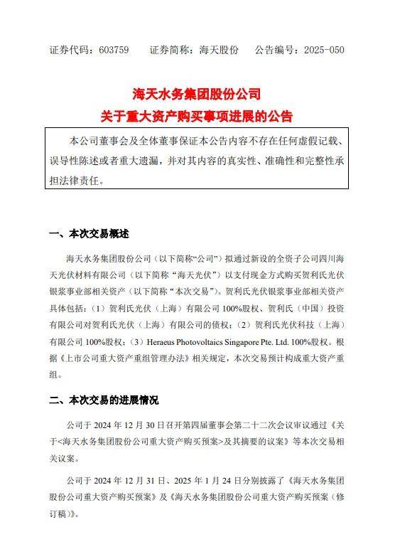 收购交易核心信息 - 海天股份通过全资子公司四川海天光伏材料有限公司以现金方式收购贺利氏光伏银浆事业部相关资产 包括贺利氏光伏(上海)有限公司100%股权及关联债权 贺利氏光伏科技(上海)有限公司100%股权和Heraeus Photovoltaics Singapore Pte Ltd 100%股权 [3] - 交易完成后 海天光伏实现对贺利氏光伏和贺利氏科技的100%控股 [10] 工商变更登记详情 - 贺利氏光伏(上海)有限公司于2025年4月8日完成投资人变更 由贺利氏(中国)投资有限公司转为四川海天光伏材料有限公司 注册资本23500万元人民币 较此前3500万元增长571.43% [6] - 贺利氏光伏科技(上海)有限公司于2025年4月2日完成类似变更 注册资本由2000万元增至15000万元 增幅650% [10] - 两家公司董事均由高昌禄 谢文祥 艾周平变更为仅高昌禄一人 监事由陈倩变更为李杏 法定代表人保持高昌禄不变 [6][10] 公司股权与控制结构 - 贺利氏(中国)投资有限公司系贺利氏亚太控股有限公司全资子公司 注册资本3000万美元 主要人员包括董事长ROLAND HEHN 总经理艾周平 董事ANDRE KOBELT 董事ROLF WETZEL和监事HERGEN HAAS [11][12] - 贺利氏集团为德国家族科技企业 业务覆盖贵金属回收 医疗健康 半导体电子及工业应用 进入中国市场已超50年 [13]