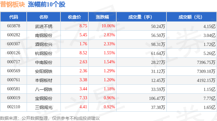 证券之星消息,1月8日普钢板块较上一交易日上涨0.52%,武进不锈领涨。当日上证指数报收于 4082.98,下跌0.07%。深证成指报收于13959.48,下跌0.51%。普钢板块个股涨跌见下表: | 代码 | 名称 | 收盘价 | 涨跌幅 | 成交量(手) | 成交额(元) | | | --- | --- | --- | --- | --- | --- | --- | | 603878 | 武进不锈 | 8.75 | 10.06% | 50.24万 | | 4.15亿 | | 600282 | 南钢股份 | 5.45 | 2.83% | 56.50万 | | 3.04亿 | | 600307 | 酒钢宏兴 | 1.76 | 2.33% | C 98.31万 | | 1.72亿 | | 600126 | 杭钢股份 | 8.52 | 1.55% | 61.64万 | | 5.26亿 | | 000717 | 中南股份 | 2.63 | 1.54% | 28.27万 | | 7396.75万 | | 600569 | 安阳钢铁 | 2.36 | 1.29% | 31.12万 | | 7309.10万 | | 00 ...