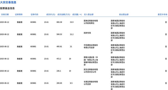 大宗交易概况 - 数据港于2025年8月12日发生大宗交易,总成交量114.6万股,总成交金额2705.71万元,占当日总成交额4.15% [1] - 成交价格23.61元,较市场收盘价26.38元折价10.5% [1] 交易明细分析 - 共6笔交易,单笔成交量介于10万股至33.9万股之间,单笔成交金额介于200.69万元至800.38万元之间 [2] - 卖出营业部均为国泰君安证券上海闵行区号文路营业部(不同交易中名称略有差异) [2] - 买入方包括国海证券机构席位、机构专用席位、中信建投总部、摩根大通证券上海银城中路、民生证券苏州分公司及长城证券总部 [2] 价格与流动性特征 - 所有交易均以统一价格23.61元成交,较当日收盘价折价10.5% [1][2] - 大宗交易总额占当日总成交额比重达4.15%,显示大宗交易对当日流动性贡献显著 [1]