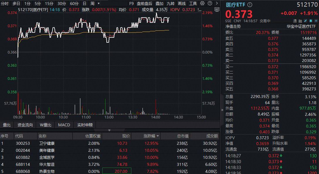 ETF盘中资讯|OpenAI押注万亿AI医疗市场!规模最大医疗ETF(512170)冲涨2%!卫宁健康飙升13%,美年健康、金域医学涨停
