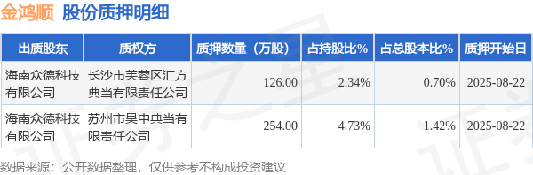 金鸿顺股东海南众德科技有限公司质押380万股,占总股本2.1205%
