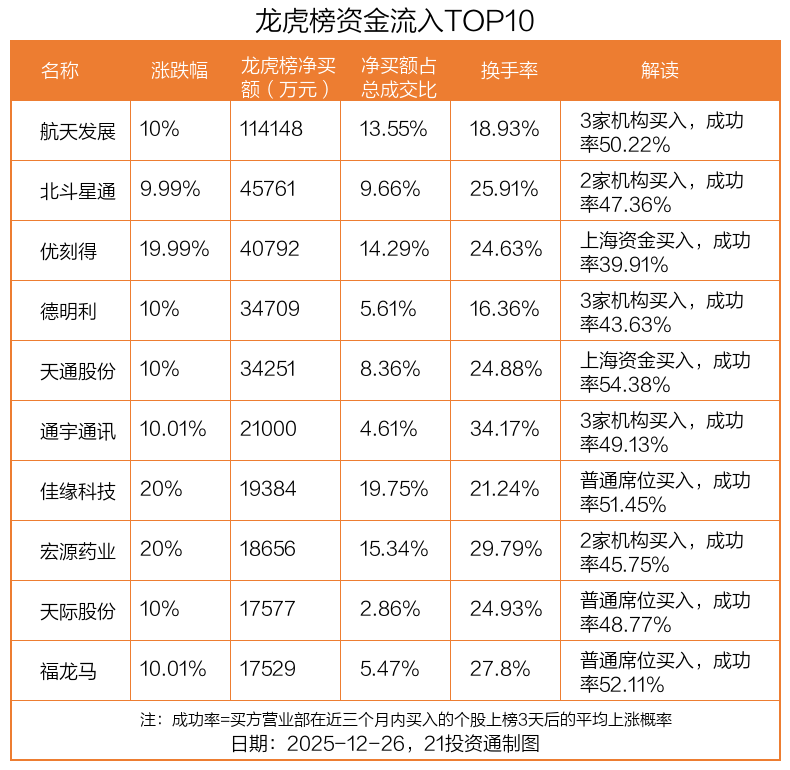 市场整体表现与资金流向 - 2025年12月26日,上证指数上涨0.1%,深证成指上涨0.54%,创业板指上涨0.14% [1] - 当日共有47只个股登上龙虎榜,其中25只被净买入,22只被净卖出 [3] - 龙虎榜资金净流入最多的个股是航天发展,净买入额达11.41亿元,占总成交金额的13.55% [1][3] - 龙虎榜资金净流出最多的个股是飞龙股份,净卖出额为3.13亿元,占总成交金额的7.17% [3] 龙虎榜个股净买入详情 - 航天发展收盘上涨10%,换手率18.93%,龙虎榜净买入11.41亿元,有3家机构买入 [3] - 北斗星通收盘上涨9.99%,换手率25.91%,龙虎榜净买入4.58亿元,有2家机构买入 [3] - 优刻得收盘上涨19.99%,换手率24.63%,龙虎榜净买入4.08亿元,由上海资金买入 [3] - 德明利收盘上涨10%,换手率16.36%,龙虎榜净买入3.47亿元,有3家机构买入 [3] - 天通股份收盘上涨10%,换手率24.88%,龙虎榜净买入3.43亿元,由上海资金买入 [3] - 通宇通讯收盘上涨10.01%,换手率34.17%,龙虎榜净买入2.10亿元,有3家机构买入 [3] - 佳缘科技收盘上涨20%,换手率21.24%,龙虎榜净买入1.94亿元,由普通席位买入 [3] - 宏源药业收盘上涨20%,换手率29.79%,龙虎榜净买入1.87亿元,有2家机构买入 [3] - 天际股份收盘上涨10%,换手率24.93%,龙虎榜净买入1.76亿元,由普通席位买入 [3] - 福龙马收盘上涨10.01%,换手率27.8%,龙虎榜净买入1.75亿元,由普通席位买入 [3] 龙虎榜个股净卖出详情 - 飞龙股份收盘下跌7.84%,换手率25.33%,龙虎榜净卖出3.13亿元 [3][4] - 安通控股收盘上涨10.08%,换手率15.41%,龙虎榜净卖出2.63亿元 [4] - 航天电子收盘上涨4.62%,换手率25.18%,龙虎榜净卖出2.31亿元 [4] - 亚翔集成收盘下跌5.09%,换手率7.53%,龙虎榜净卖出2.27亿元 [4] - 海南发展收盘上涨10.01%,换手率28.37%,龙虎榜净卖出1.75亿元 [4] - 华菱线缆收盘上涨3.02%,换手率62.13%,龙虎榜净卖出1.72亿元 [4] - 再升科技收盘上涨9.98%,换手率43.01%,龙虎榜净卖出1.49亿元 [4] - 圣晖集成收盘下跌3.4%,换手率9.68%,龙虎榜净卖出1.23亿元 [4] - 博云新材收盘无涨跌,换手率37.02%,龙虎榜净卖出1.15亿元 [4] - 优迅股份收盘下跌8.72%,换手率35.12%,龙虎榜净卖出6929万元 [4] 机构资金动向 - 当日龙虎榜有30只个股出现机构身影,机构合计净买入5.17亿元 [4] - 机构净买入15只个股,净卖出15只个股 [4] - 机构净买入金额最多的是航天发展,净买入4.82亿元,占总成交的5.72%,有3家买方机构且无卖方机构 [5][6] - 机构净买入金额第二多的是德明利,净买入2.05亿元,占总成交的3.31%,有3家买方机构和2家卖方机构 [6] - 机构净卖出金额最多的是亚翔集成,净卖出2.47亿元,占总成交的14.03% [9] - 机构净卖出金额第二多的是天际股份,净卖出1.37亿元,占总成交的2.23%,有3家卖方机构 [9] - 机构净卖出金额第三多的是圣晖集成,净卖出1.28亿元,占总成交的15.49% [9]