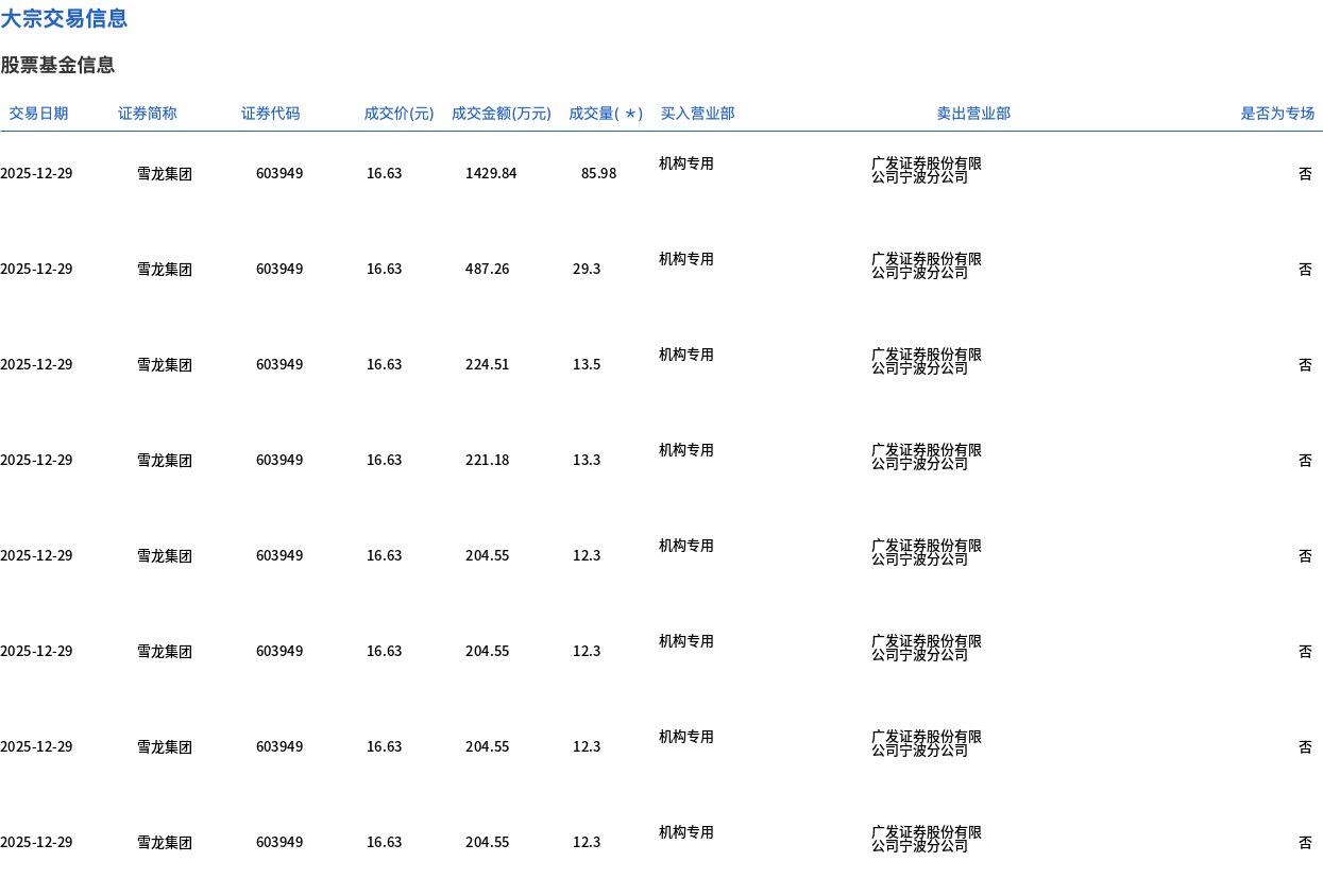 12月29日,雪龙集团大宗交易成交191.28万股,成交额3180.99万元,占当日总成交额的17.95%,成交价16.63元,较市场收盘价18.9元折价12.01%。 | 交易日期 | 证券简称 | 证券代码 | 成交价(元) | | 成交金额(万元) 成交量(*) 买入营业部 | | 卖出营业部 | | --- | --- | --- | --- | --- | --- | --- | --- | | 2025-12-29 | 雪龙集团 | 603949 | 16.63 | 1429.84 | 85.98 | 机构专用 | 公昌市委常公司 | | 2025-12-29 | 雪龙集团 | 603949 | 16.63 | 487.26 | 29.3 | 机构专用 | 厂发证券投公有限 公司宁波分公司限 | | 2025-12-29 | 雪龙集团 | 603949 | 16.63 | 224.51 | 13.5 | 机构专用 | 厂发证券股公有限 | | 2025-12-29 | 雪龙集团 | 603949 | 16.63 | 221.18 | 13.3 | 机构专用 | 公司宁波的公司限 | | 2025- ...