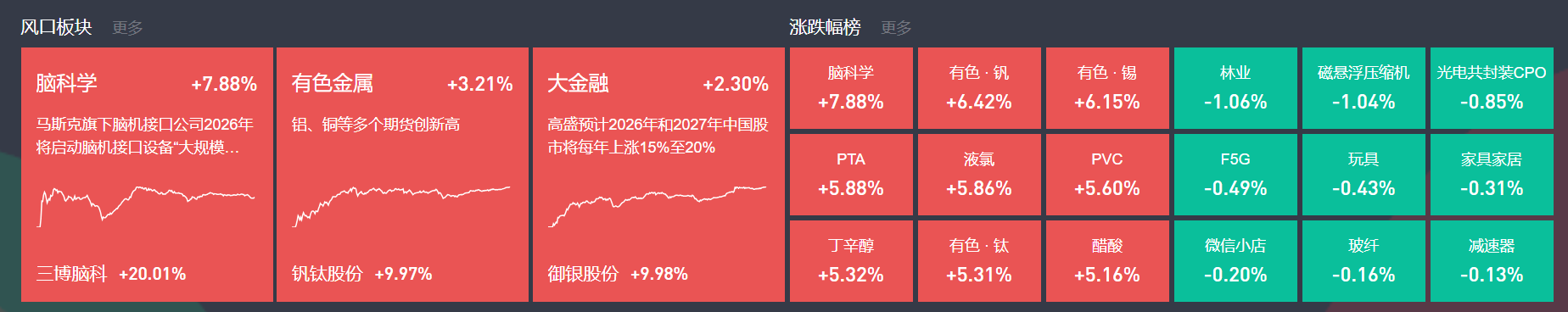 一、当日行情分析 1、市场观察 1月8日,沪指窄幅震荡,创业板指盘中跌超1%。沪深两市成交额2.8万亿,较上一个交易日缩量538亿,成交额连续4个交易日超2.5万亿。截至收盘,沪指跌 0.07%,深成指跌0.51%,创业板指跌0.82%。 | 大涨板块 | 260108 (周4) | 260107 (周3) | 260106 (周2) | 260105 (周1) | | --- | --- | --- | --- | --- | | 1 | 玩天53 | 光刻机 (胶) 12 | 脑科学21 | 脑科学36 | | 2 | 核聚变11 | 7 356 | 有色金属11 | 国产成片22 | | 3 | 脑科学10 | 煤炭4 | 大金融12 | 航天21 ▲ | | ব | 国产市片10 | 有色 · 誤2 | 无人驾驶13 | 人工智能大模型13 | | 5 | 机器人11 | 国产市片15 | 航天27 | 机器人13 | | 6 | ST股20 | 航天184 | ST股23 | ST股18 | | 7 | 医药6 | ST股17 | 国产芯片13 | 医药19 | | 8 | 光伏4 | 机器人9 | ...