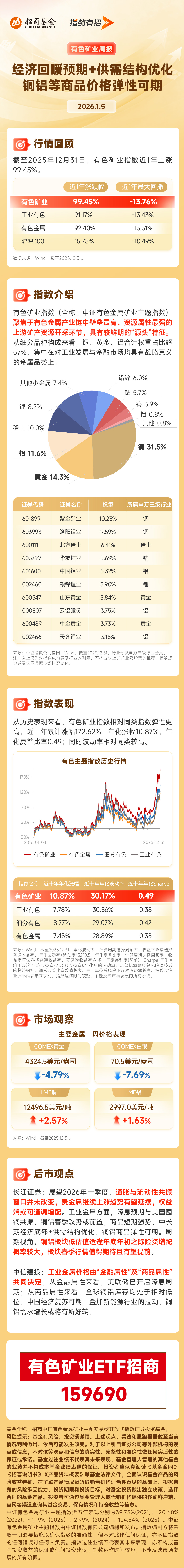 稀有金属ETF基金表现与构成 - 华富稀有金属ETF基金(561800)近1年累计上涨105.92% [1] - 该基金紧密跟踪中证稀有金属主题指数(930632),指数前两大权重为锂(33.67%)和稀土(24.63%) [1] - 截至2025年12月31日,指数前十大权重股合计占比59.54%,包括洛阳钼业、北方稀土、华友钴业、盐湖股份、赣锋锂业、天齐锂业、中矿资源、厦门钨业、中国稀土、西部超导 [1] 近期板块表现的催化因素 - 情绪面上,元旦期间委内瑞拉突发事件印证全球政治局势脆弱性,催化“资源为王”逻辑 [1] - 我国商务部近期加强军民两用物项对日本出口管制,凸显稀土资源的战略地位,使重仓稀土的指数直接受益 [1] 锂行业基本面分析 - 自去年5-6月碳酸锂期货触及6万元/吨低位后,过去半年多持续上涨,去年年底已收至12万元/吨上方 [2] - 上涨背景包括国内碳酸锂矿企停产检修以及储能行业高景气带来的需求快速增长 [2] - 2026年开年以来,碳酸锂期货在多重因素催化下继续快速上涨 [2] - 随着碳酸锂供给端资本开支高峰期过去,叠加新能源及AI产业链高景气度,市场普遍认为2026年有望成为碳酸锂的供需转折之年 [2] 钴行业基本面分析 - 过去一年,在主要资源国刚果金持续加强出口管控的背景下,钴价持续上涨 [2] - 当前在刚果金“钴”出口配额受限背景下,未来大概率维持供不应求格局,钴价仍有向上空间 [2] 指数优势与前景 - 中证稀有金属主题指数(CS稀金属指数)是市面上能源金属(“锂”和“钴”)含量最高的指数之一,有望持续受益于相关金属的基本面变化 [2]