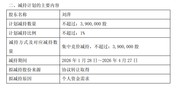 减持计划核心信息 - 股东刘萍女士在减持计划实施前持有公司无限售条件流通股1965万股,占公司总股本比例为5% [1] - 刘萍女士计划通过集中竞价交易方式减持公司股份不超过390万股 [1] - 减持计划期间为自公告披露之日起15个交易日之后的3个月内,具体时间为2026年1月28日至2026年4月27日 [1]