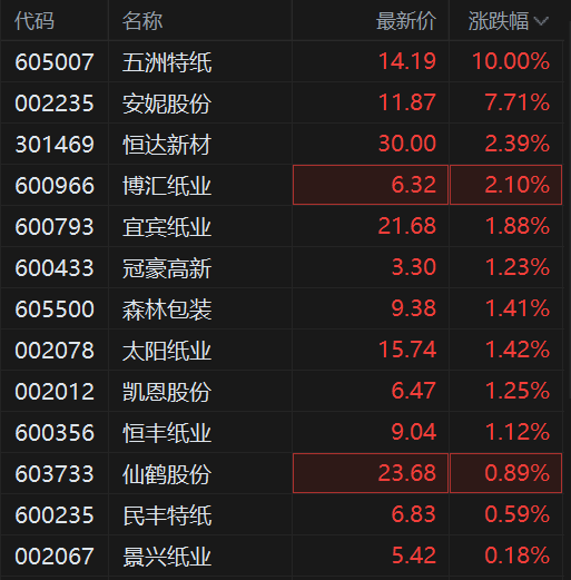 消息上,近期,以玖龙、山鹰、理文、荣成为代表的包装纸企业大规模停机检修,主动收缩产能;博 汇、APP、万国纸业、亚太森博等白卡纸及文化纸厂商集体宣布涨价。这种"停机+涨价"的并存的现 象,凸显不同纸种在成本结构、供需关系和市场预期上的显著差异。 纸业股盘初继续活跃,其中,五洲特纸涨停录得2连板,安妮股份一度涨超8%,博汇纸业、恒达新材涨 超2%,宜宾纸业、太阳纸业、宜宾包装、恒丰纸业、凯恩股份均涨超1%。 | 代码 | 名称 | 最新价 | 涨跌幅 √ | | --- | --- | --- | --- | | 605007 | 五洲特纸 | 14.19 | 10.00% | | 002235 | 安妮股份 | 11.87 | 7.71% | | 301469 | 恒达新材 | 30.00 | 2.39% | | 600966 | 博汇纸业 | 6.32 | 2.10% | | 600793 | 宜宾纸业 | 21.68 | 1.88% | | 600433 | 冠豪高新 | 3.30 | 1.23% | | 605500 | 森林包装 | 9.38 | 1.41% | | 002078 | 太阳纸业 | 1 ...