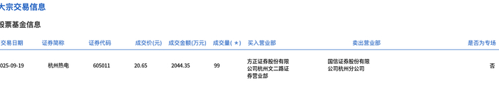 大宗交易概况 - 杭州热电于9月19日发生大宗交易成交99万股,成交金额达2044.35万元,占当日总成交额的11.08% [1] - 成交价格为20.65元,较市场收盘价22.45元折价8.02% [1] 交易细节 - 证券代码为605011,买入营业部为方正证券股份有限公司杭州文二路证券营业部 [2] - 卖出营业部为国信证券股份有限公司杭州分公司 [2]