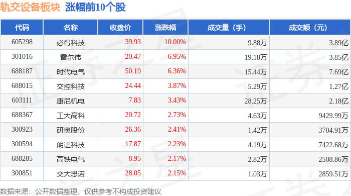 轨交设备板块市场表现 - 轨交设备板块较上一交易日上涨9.23% [1] - 上证指数上涨0.38%至3826.84点 深证成指上涨0.61%至12666.84点 [1] 领涨个股表现 - 必得科技领涨板块 收盘价39.93元 涨幅10.00% 成交量9.88万手 成交额3.89亿元 [1] - 雷尔伟涨幅6.95%至20.47元 成交量19.18万手 成交额3.85亿元 [1] - 时代电气涨幅6.36%至50.19元 成交量15.44万手 成交额7.69亿元 [1] 其他上涨个股 - 交控科技上涨3.87%至24.44元 成交量5.29万手 成交额1.27亿元 [1] - 康尼机电上涨3.43%至7.83元 成交量28.25万手 成交额2.18亿元 [1] - 工大高科上涨2.73%至20.72元 成交量4.63万手 成交额9429.99万元 [1] 下跌个股表现 - 时代新材下跌1.17%至15.17元 成交量20.64万手 成交额3.12亿元 [2] - 九州一轨下跌0.51%至13.58元 成交量2.11万手 成交额2850.33万元 [2] - 祥和实业微跌0.09%至11.19元 成交量11.48万手 成交额1.28亿元 [2] 资金流向情况 - 板块主力资金净流入1.02亿元 游资资金净流出9993.37万元 散户资金净流出218.6万元 [2] - 时代电气主力净流入1.01亿元 占比13.14% 游资净流出6672.83万元 占比-8.68% [3] - 必得科技主力净流入5296.49万元 占比13.62% 游资净流出1588.86万元 占比-4.09% [3] 个股资金流向特征 - 中国中车主力净流入2371.44万元 占比2.37% 游资净流入2148.70万元 占比2.14% [3] - 交控科技主力净流入1580.02万元 占比12.46% 游资净流出40.76万元 占比-0.32% [3] - 众合科技主力净流入758.40万元 占比6.07% 游资净流入305.74万元 占比2.45% [3]